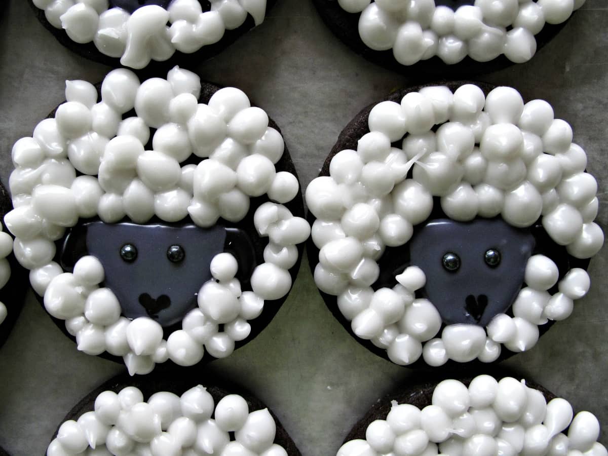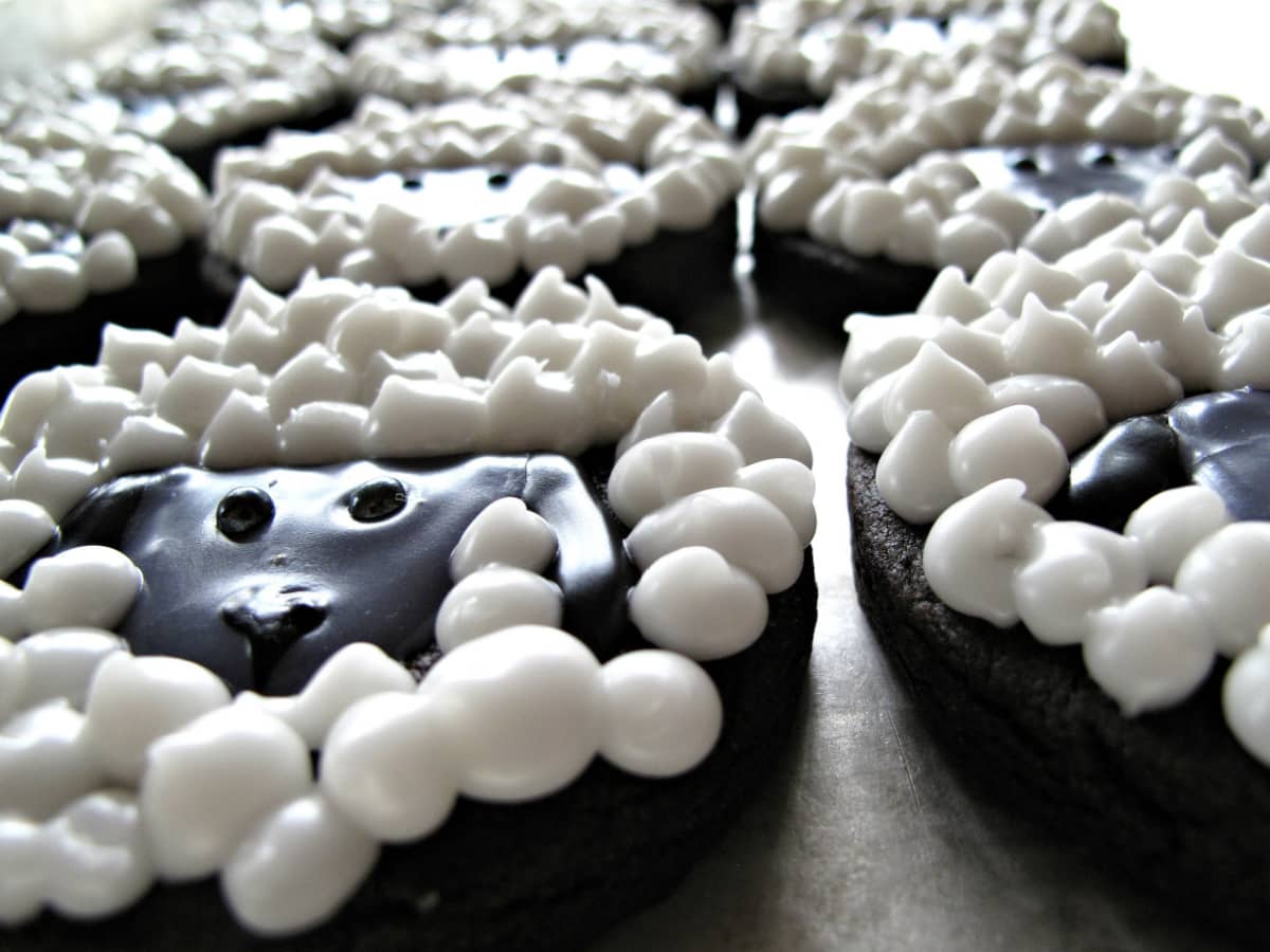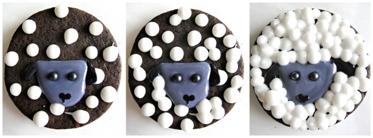 - The wooly body of the sheep is made with the thick white icing. Starting on the outer edge of the cookie, pipe dots of varying sizes aroundthe cookie. Continue piping around the cookie (3 or 4 times) until the body isfilled.