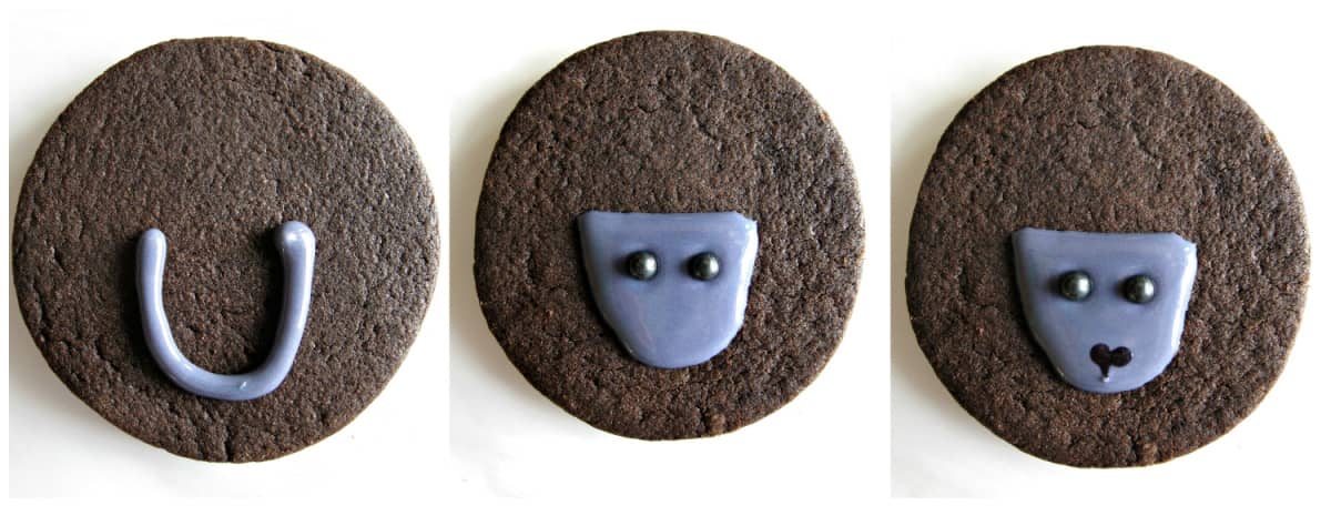- Slightly below the center of the cookie, use the gray icing to outline, thenfill in, an elongated "U".