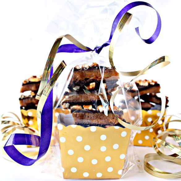 Toffee can easily be made nut free and gluten free. This recipe adds chopped pretzels on top instead of the traditional nuts. Gluten free pretzels can be substituted.