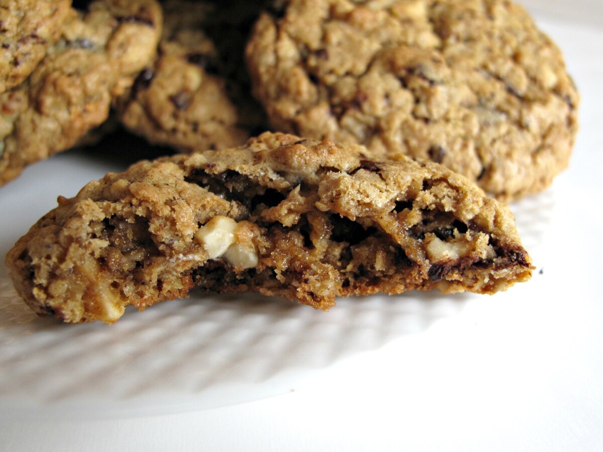 Thick oatmeal runners cookies with bits of chocolate, dried fruit, and peanuts.