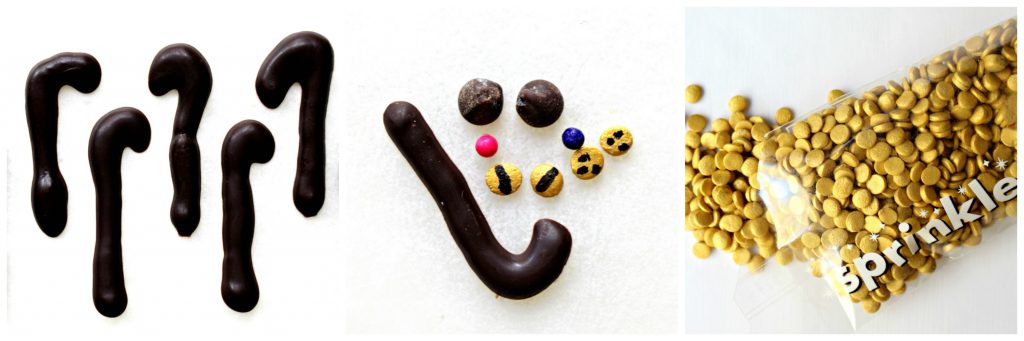 The sprinkles slid around and it was too easy to smear the melted chocolate where it didn't belong. Instead, I used a toothpick to add a dab of melted chocolate to the sprinkles to "glue" them in place on the set coating.