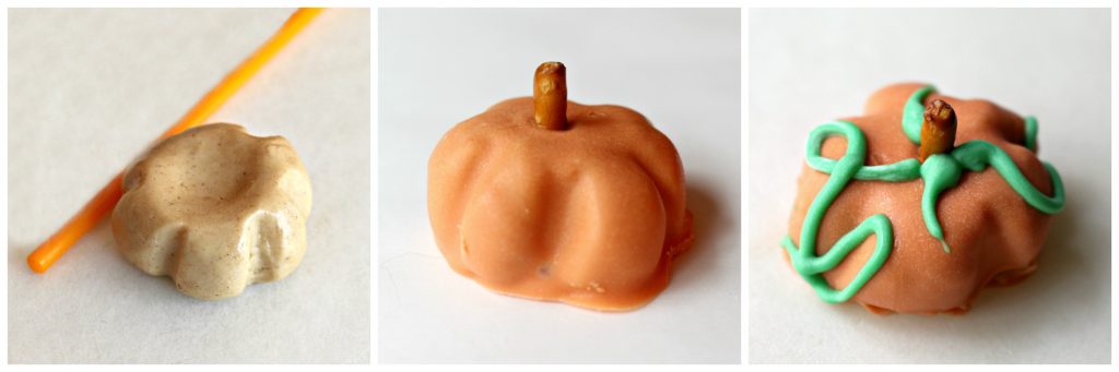The pumpkins are dipped in orange coating and a 1" piece of pretzel stick is added for a stem. When the orange coating is dry, green leaves and vines are piped on.