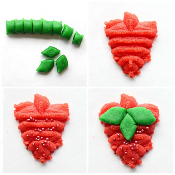 - Use the reserved green dough to create strawberry leaves. Pinch off about a tablespoon of dough and roll ii into a snake shape about ¼" thick. Cut the snake into small pea sized segments. Pinch the segments into small diamond shapes.