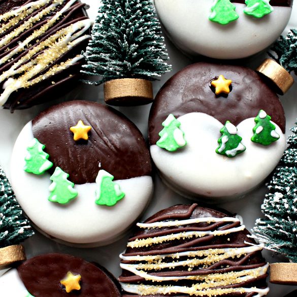 Winter Wonderland Chocolate Dipped Oreos turn simple chocolate sandwich cookies into exceptional treats. Decorating the cookies with a winter scene is quick and easy with shaped sprinkles. For holiday cookie trays, gifts, and care packages, these chocolate coated Oreos make a sweet impression.