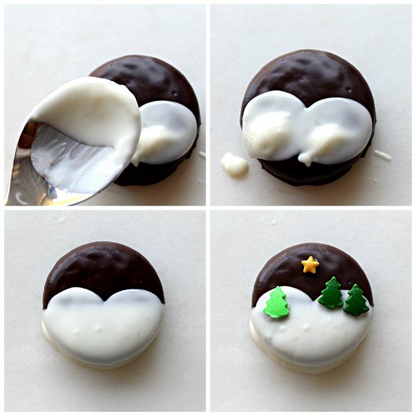 - Make rounded hills by dipping the back of a teaspoon in white chocolate and dabbing it onto the cookie before dunking the cookie into the chocolate.